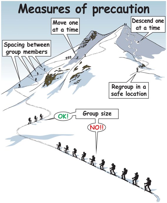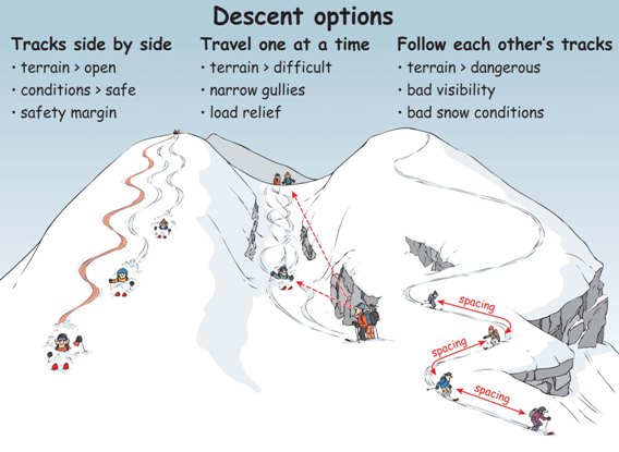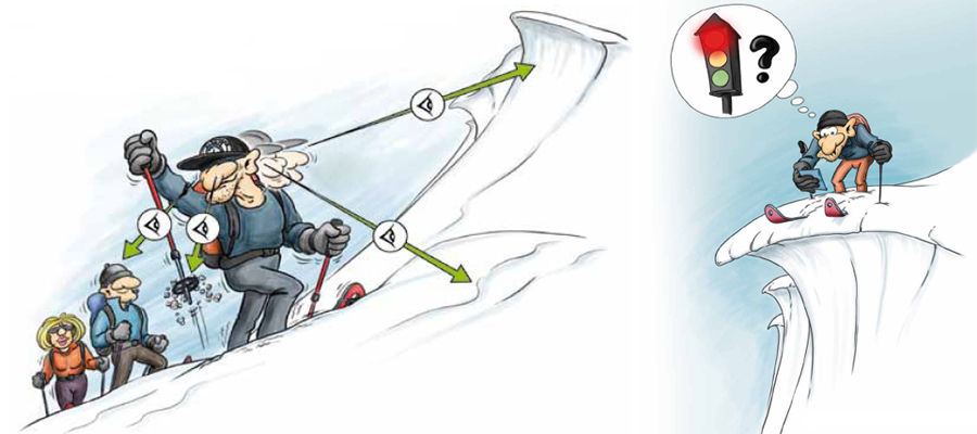 -Несколько человек, бродящих по склону, с гораздо большей вероятностью найдут точку схода лавины, чем один человек. В небольших группах подвергайте потенциальной опасности только одного человека одновременно.