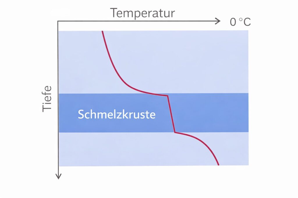 Почему это происходит? Снежный покров в середине зимы обычно сохраняет много холода. Температура значительно ниже 0°C, поэтому снежный покров далек от таяния. Если в такой ситуации идет дождь, вода часто проникает в снежный покров всего на несколько сантиметров. Часто насыщение затрагивает только верхние слои снега, которые сильно насыщаются влагой при длительных или обильных осадках.