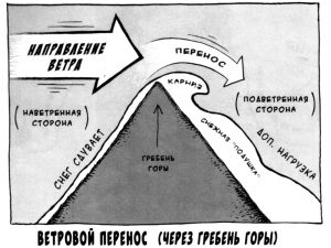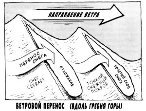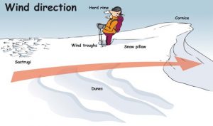 «Ветер – главных архитектор лавин». Это важнейший лавинообразующий фактор, который ни в коем случае нельзя недооценивать! Если ветер достаточно сильный, чтобы переносит снег, то лавинная ситуация можете кардинально измениться со стабильной на опасную даже без новых снегопадов. Следите за ветром в гребневой зоне и остерегайтесь перегруженных метелевым снегом (подветренных) склонов и кулуаров. И не забывайте про карнизы!!!