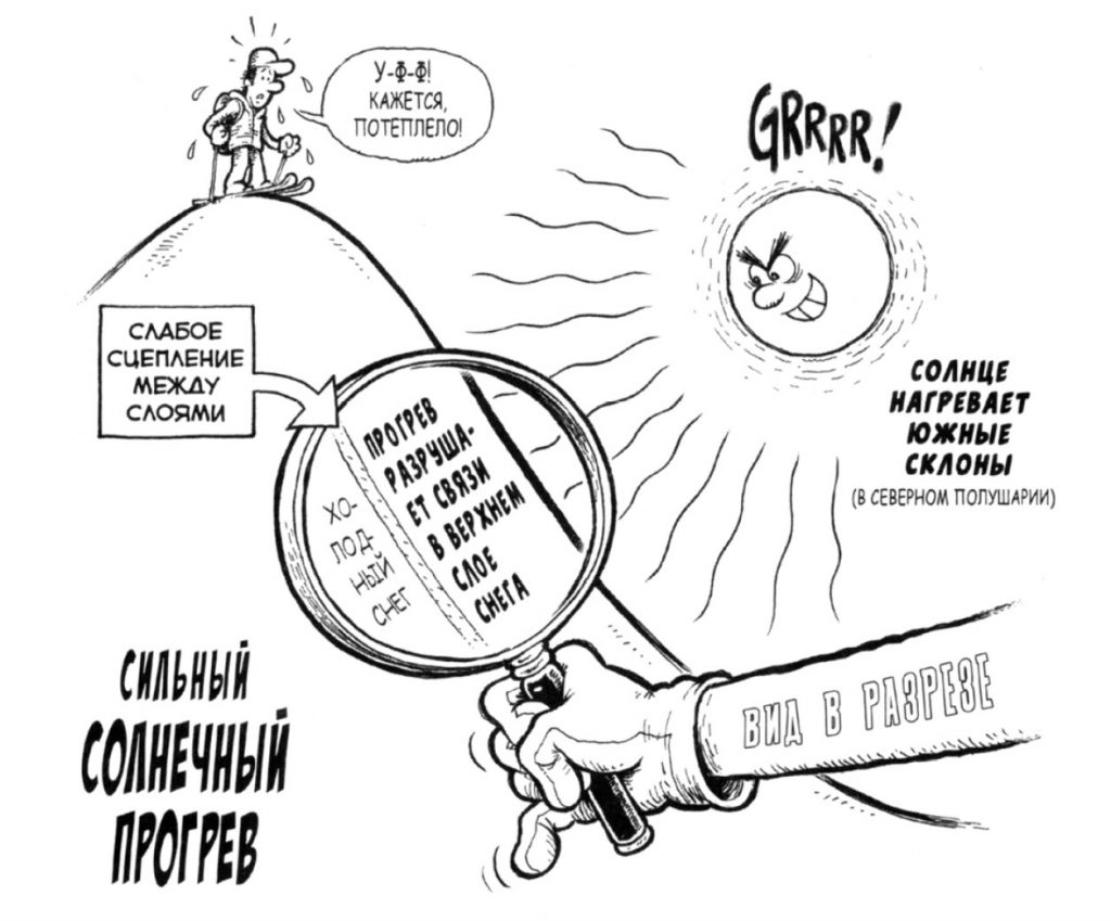 Независимо от того, какая была начальная температура, любое быстрое (>5 градусов/за 3 часа) повышение температуры опасно, потому что снежный покров не успевает приспособиться к таким резким изменениям. Примите дополнительные меры предосторожности в первый теплый день после цикла снегопадов и внимательно относитесь к выбору экспозиции склона!